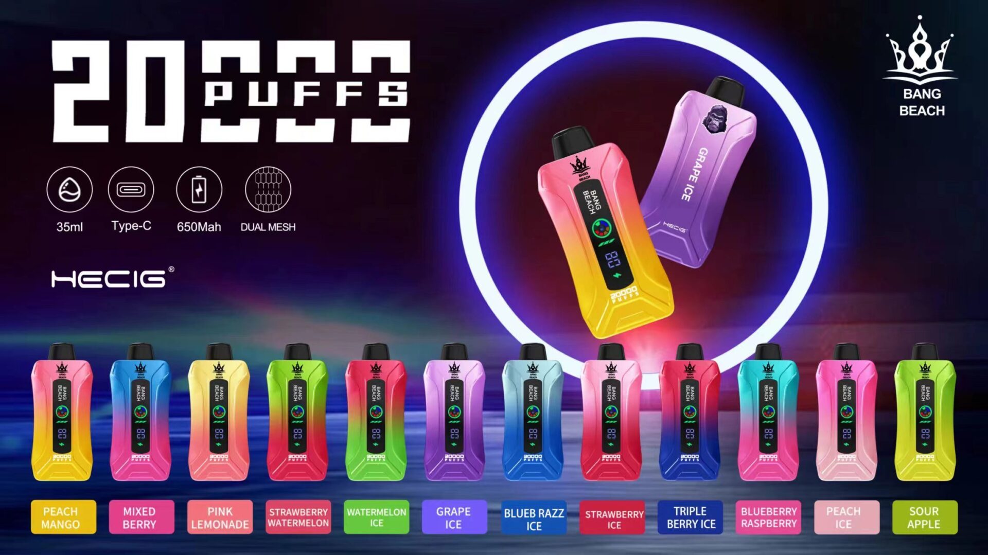 Dive into the vast flavor world of Bang Beach 20000, featuring up to 25000 puffs, a 650mAh battery, and 35ml of e-liquid. Enjoy a wide array of 12 refreshing flavors for a superior vaping journey.