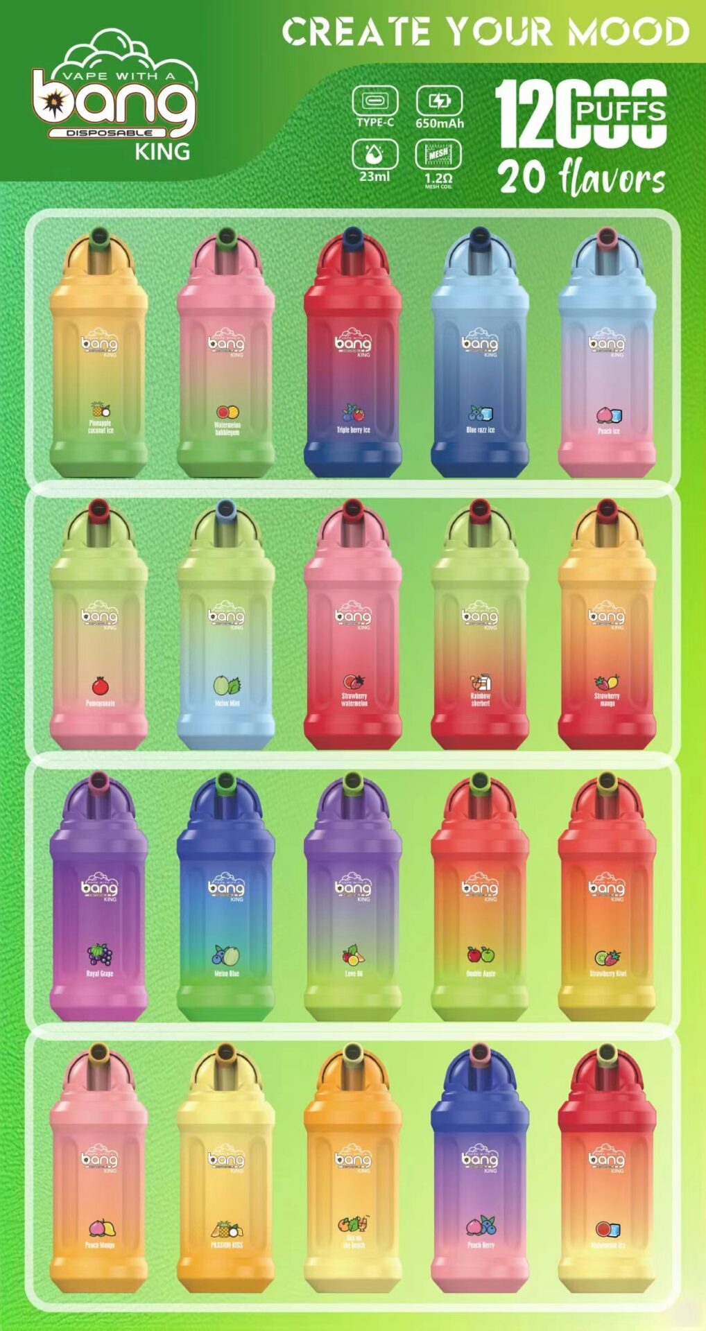 The Bang King 12000 is designed for those who seek both variety and volume in their vaping experience. With its extensive range of flavors and high-performance specifications, it stands as an ideal choice for both casual and dedicated vapers alike.