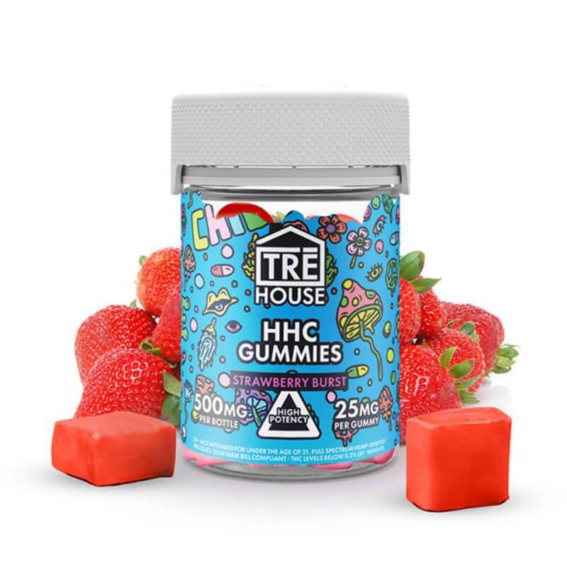 TRE House HHC Edible High Potency Strawberry Burst Gummies give you a convenient way to supplement your daily HHC intake. Each gummy contains 25mg of HHC and comes in a mouth-watering strawberry burst flavor. The gummies are both vegan and gluten-free, making them suitable for a wide range of dietary requirements. With just one gummy per serving and 20 gummies per bottle. Formulated to deliver the full benefits of HHC. HHC, or Human Health and Care, they are designed to help you achieve optimal health, improve your mental clarity and focus, and enhance your overall quality of life.