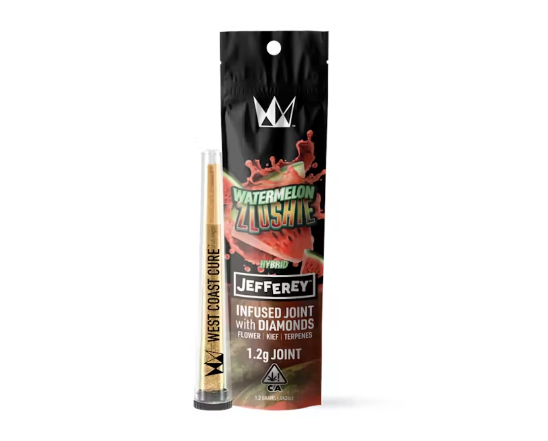 The Watermelon Zlushie Jefferey Single is a 1.2-gram powerhouse of a pre-roll, expertly crafted for those who crave quality. Rolled with WCC’s top-tier whole nug flower, this joint is supercharged with visible THCa diamonds, high-end kief, and subtly enhanced with all-natural terpenes. No trim, shake, or old flower here—just green, frosty goodness ground in-house in small batches for optimal freshness.
